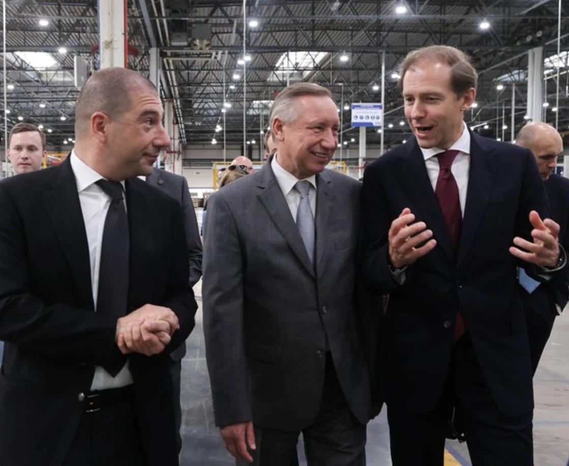 Từ trái sang: Doanh nhân Armen Sarkisyan – Chủ sở hữu S8 Capital; Thống đốc St. Petersburg Alexander Beglov và Bộ trưởng Thương mại Nga Denis Manturov thăm nhà máy thang máy vào năm 2022. Nhà máy này từng thuộc sở hữu của Otis Worldwide có trụ sở tại Mỹ, bây giờ nó thuộc sở hữu của doanh nhân Nga Armen Sarkisyan. Ảnh: TASS