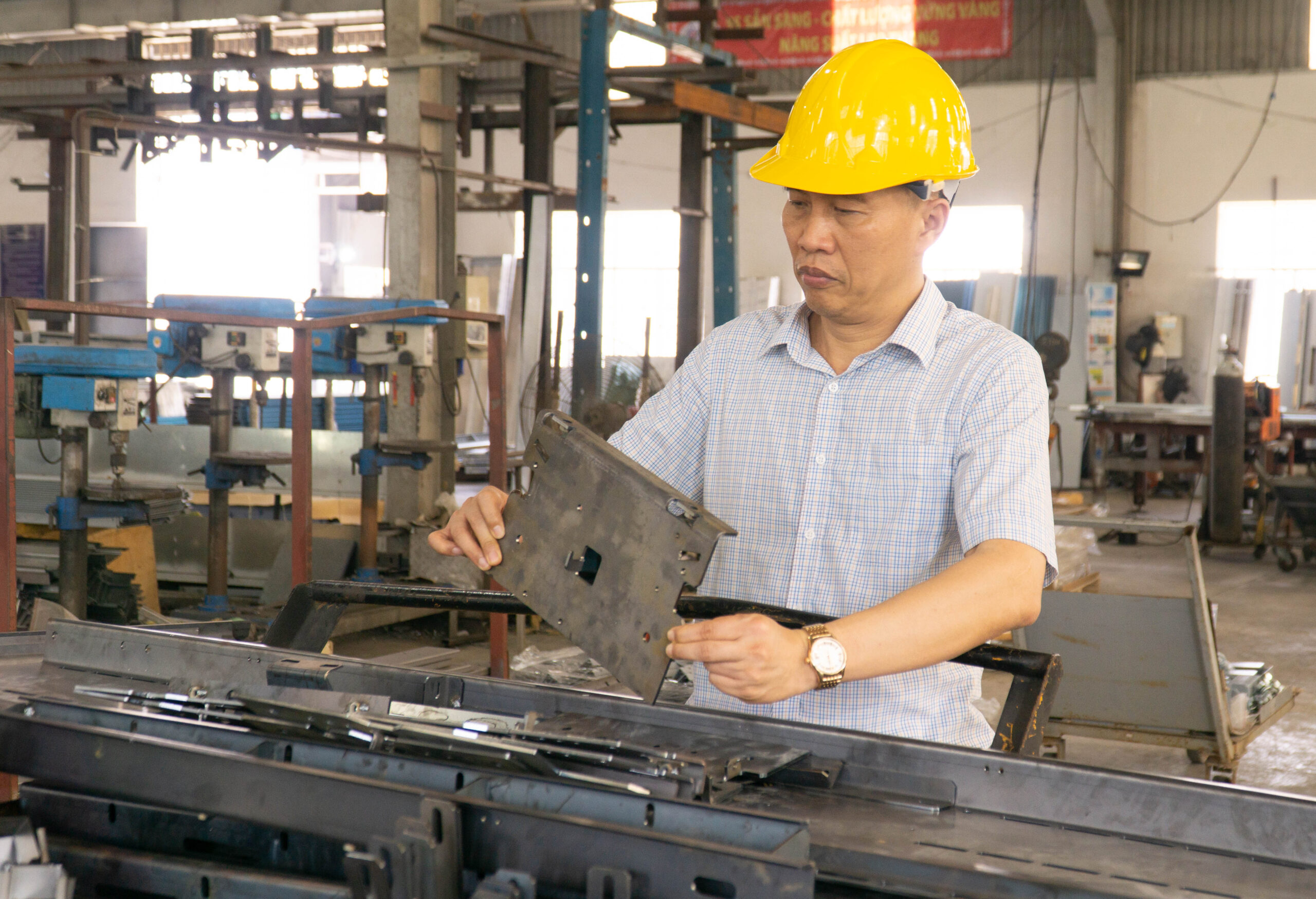 CEO Trần Thọ Huy bên cạnh sản phẩm tủ điều khiển – trái tim của thang máy