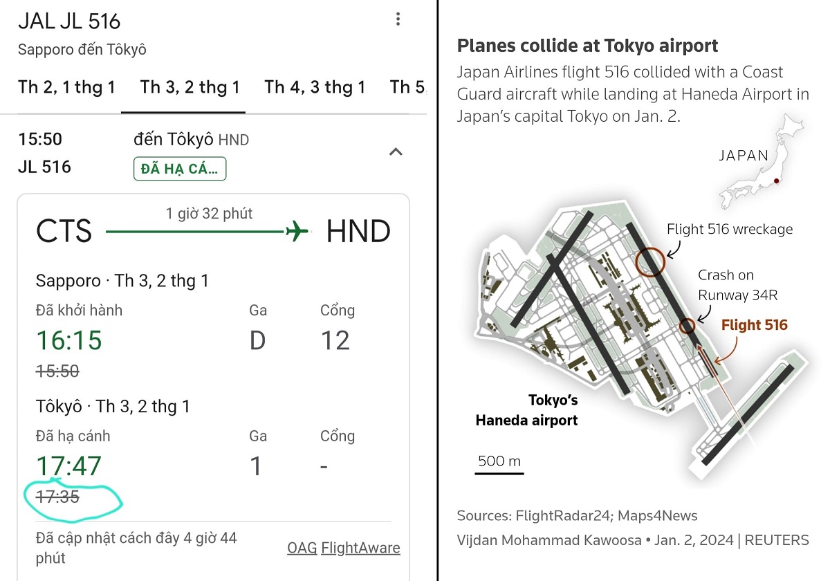 Máy bay chở khách A-350-900 mang số hiệu JAL JL 516 chở theo 379 người gồm 367 hành khách và 12 thành viên phi hành đoàn từ sân bay Sapporo tới sân bay Haneda, Tokyo lẽ ra xuất phát 15:50 chiều nay (2/1/2024) và dự kiến hạ cánh lúc 17:35 nhưng lại xuất phát muộn lúc 16:15 và hạ cánh muộn hơn lịch thông thường vào lúc 17:47.