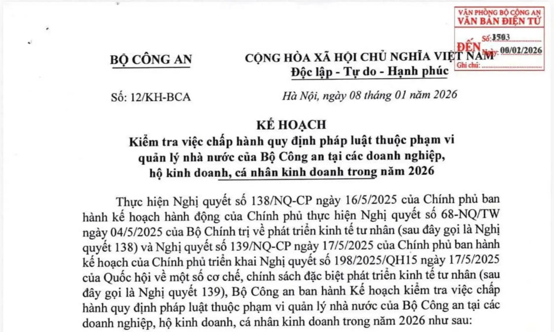 Mới đây, Bộ Công an đã ban hành kế hoạch số 12/KH-BCA kiểm tra việc chấp hành quy định pháp luật thuộc phạm vi quản lý nhà nước của cơ quan này tại các doanh nghiệp, cá nhân kinh doanh trong năm 2026.