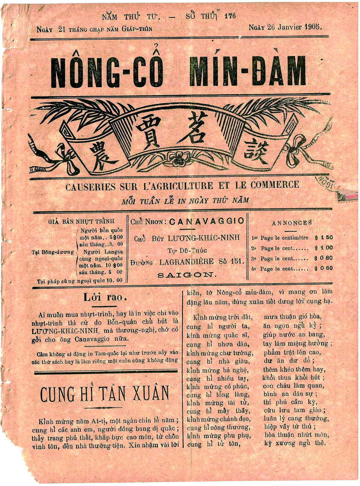 Tờ “Nông-Cổ Mín-Đàm” ra ngày 26/1/1905 (năm Giáp Thìn).