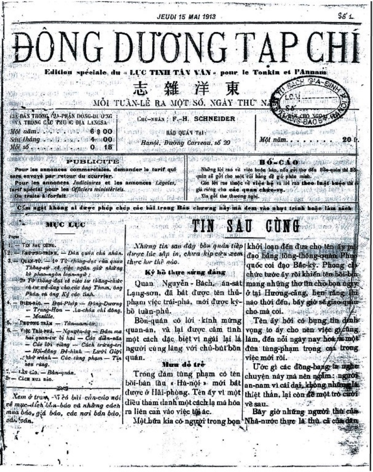 Đông Dương tạp chí số 1, ra ngày 15/5/1913