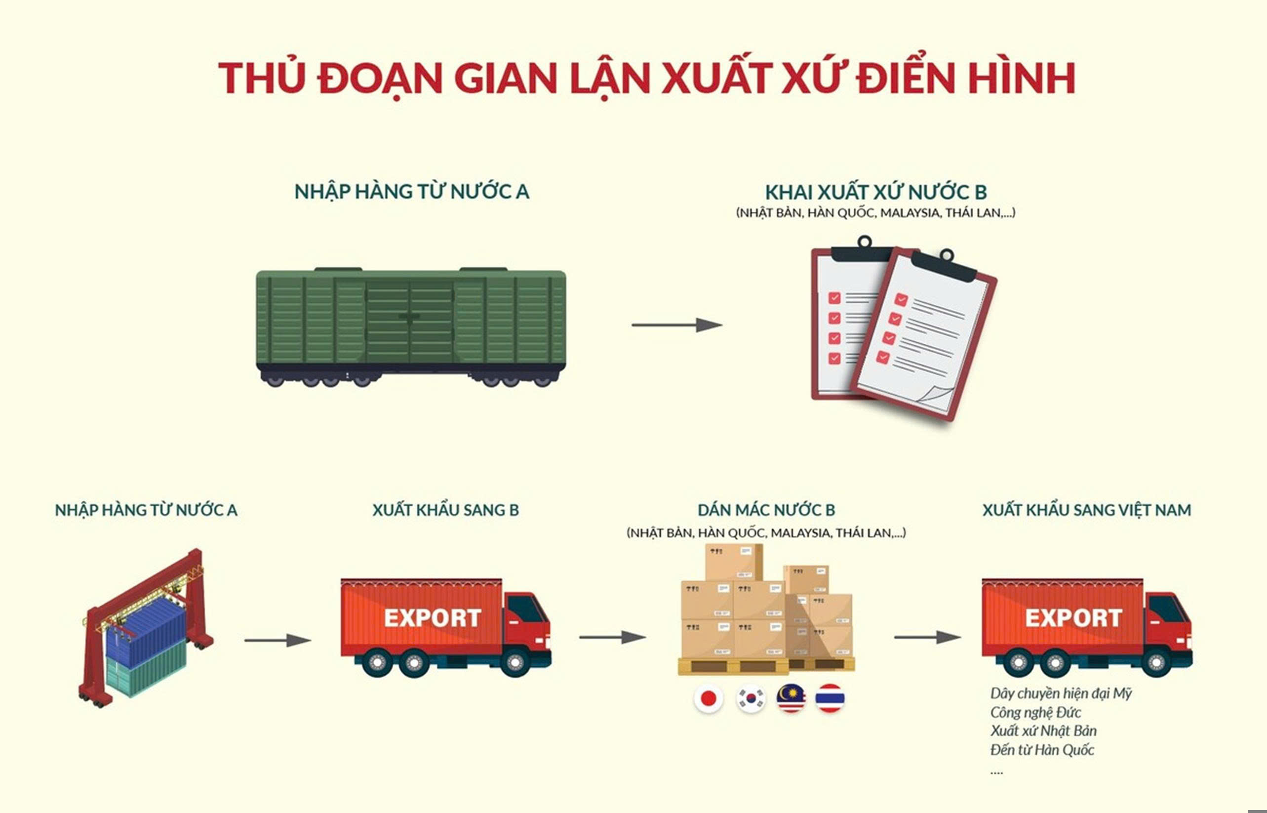 Doanh nghiệp khai sai về tên hàng hóa, chủng loại, xuất xứ,… che giấu về nguồn gốc, tuyến đường của lô hàng, nhập khẩu hàng hóa từ nước A sang nước B để lấy xuất xứ của nước B rồi nhập về Việt Nam, sau đó quảng cáo “Xuất xứ Nhật Bản/Hàn Quốc/Thái Lan…”.