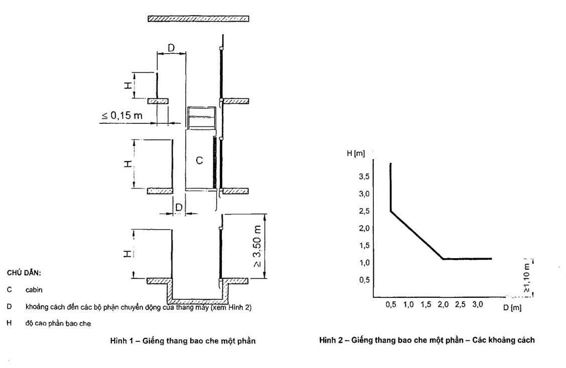Các thông số kích thước trong trường hợp giếng thang bao che một phần theo TCVN 6396-20:2017 về Yêu cầu an toàn về cấu tạo và lắp đặt thang máy – thang máy chở người và thang máy chở hàng