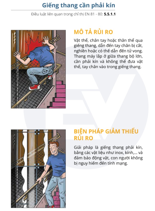 Cụ thể: Trong trường hợp giếng thang không kín, vật thể, chân tay hoặc thân thể qua giếng thang có thể dẫn đến tai nạn chân tay hoặc thân thể bị cắt, nghiền, thậm chí có thể dẫn đến tử vong. Do đó, để giảm thiểu rủi ro, thang máy lắp ở giữa thang bộ thì giếng thang cần phải kín, làm bằng các vật liệu như inox, kính chịu lực... và đảm bảo không thể đưa vật thể, tay chân vào trong giếng thang gây nguy hiểm đến tính mạng.