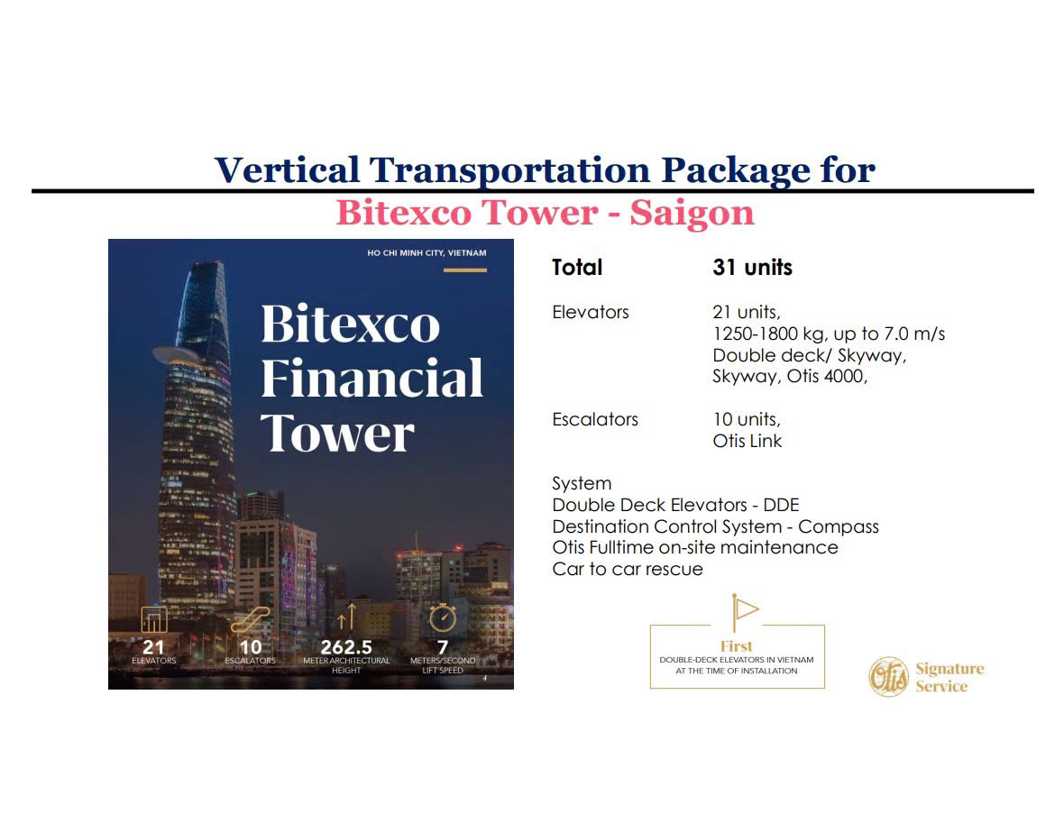 Otis được lựa chọn là nhà cung cấp duy nhất toàn bộ hệ thống vận chuyển theo chiều dọc của tòa tháp với 31 thiết bị, bao gồm 21 thang máy và 10 thang cuốn. Các thang máy tại Bitexco có tải trọng từ 1.250 đến 3.000kg mỗi cabin, tốc độ vận hành tối đa 7 m/s.