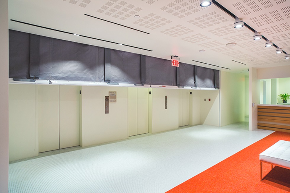 - Additional door assemblies installed in front of the elevator landing doors - typically consisting of smoke curtains or temporary roll-down barriers that have been tested for smoke and draft control in accordance with UL 1784 (Standard for Air Leakage Tests of Door Assemblies). These curtains are deployed automatically upon activation of the building’s fire alarm and sprinkler systems;