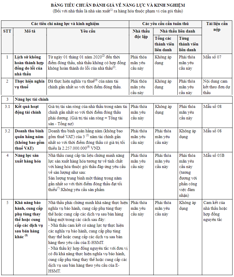Bảng tiêu chuẩn đánh giá về năng lực và kinh nghiệm đối với nhà thầu là nhà sản xuất ra hàng hóa thuộc phạm vi của gói thầu: