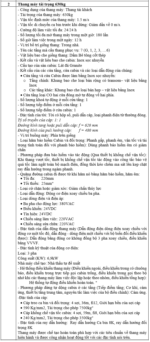 Các yêu cầu về kỹ thuật thang máy cũng đảm bảo yếu tố công bằng, minh bạch khi không đưa ra cụ thể nhãn hiệu, xuất xứ hàng hóa trong hồ sơ mời thầu. Nhà thầu có thể tự đề xuất hãng, xuất xứ thang máy.