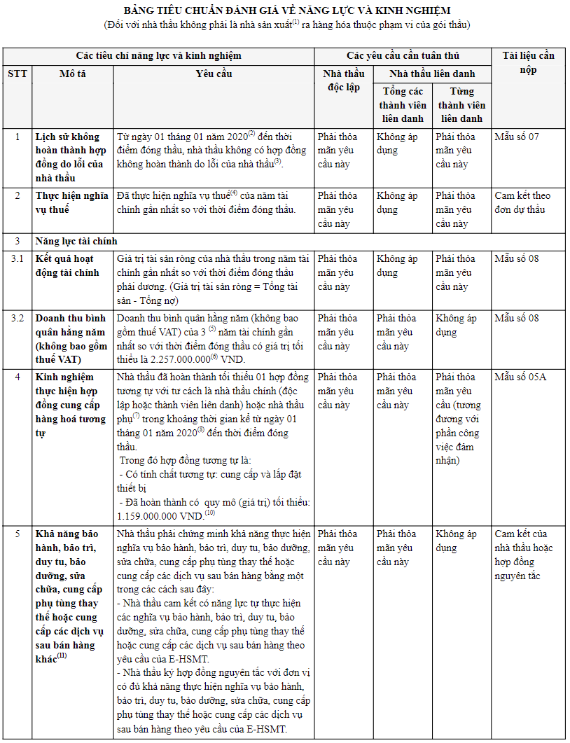 Bảng tiêu chuẩn đánh giá về năng lực và kinh nghiệm đối với nhà thầu không phải là nhà sản xuất ra hàng hóa thuộc phạm vi của gói thầu: