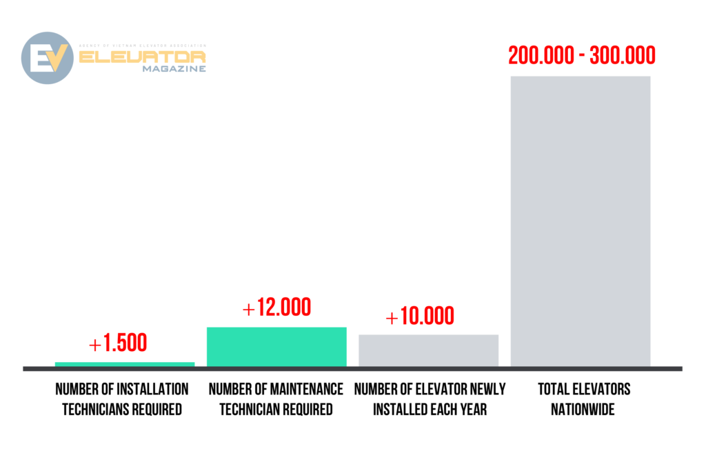 Currently, there are about 250,000 - 300,000 elevators installed and used across the country. Every year, about 10,000 new elevators are installed and this number will continue to increase in the coming time. Mechanically, the number of technical staff required to perform maintenance and repair will be about 12,000 people (1 person/25 elevators). The number of staff to install the elevator needs about 1,500 people (7 people / 1 elevator).