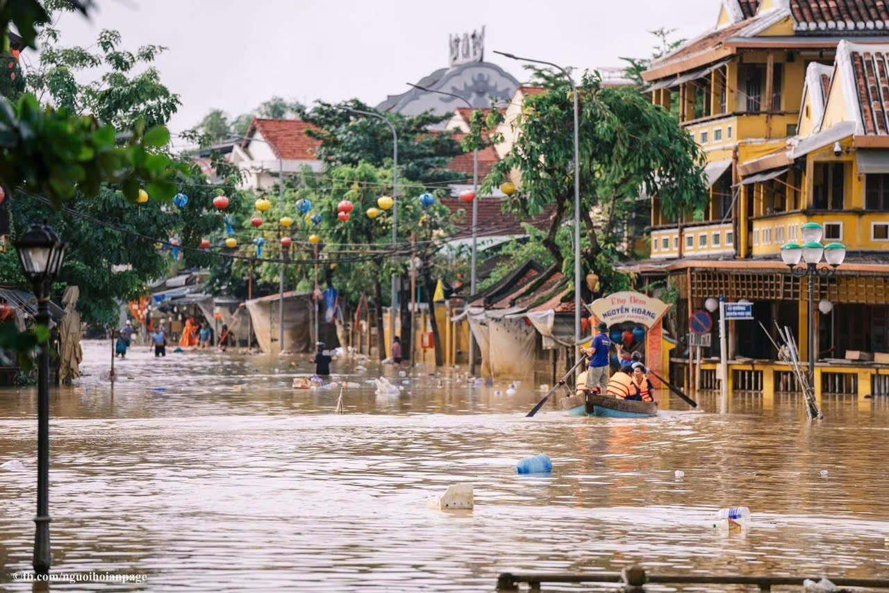 Tại khu vực phố cổ Hội An, ngày 30/10/2025, nước lụt đã bắt đầu rút, những tuyến đường trong phố cổ ngập tràn bùn non cùng lá cây, rác thải.