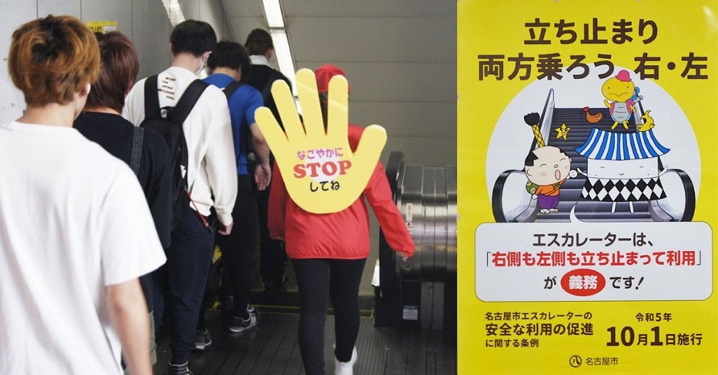 Tại Nhật Bản, có một luật bất thành văn là mọi người phải đứng yên ở bên trái thang cuốn và để trống bên phải cho những ai muốn đi lên nhanh. Tuy nhiên, từ 1/10/2023, tỉnh Nagoya đã áp dụng quy định yêu cầu mọi người đứng yên ở hai bên thang cuốn, cấm mọi người đi bộ trên thang cuốn.