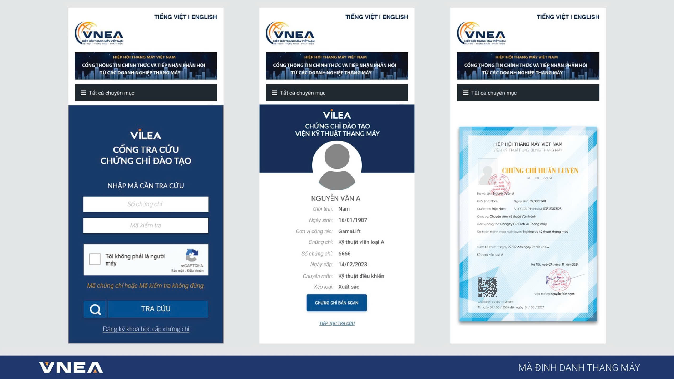 Song song, Hiệp hội Thang máy Việt Nam cũng xây dựng Hệ thống Tra cứu Chứng chỉ Trực tuyến. Tất cả thông tin đào tạo của học viên sẽ được số hóa, tích hợp và lưu trữ trên Cổng Thông tin Hiệp hội. Thông qua việc tra cứu mã số chứng chỉ hoặc quét mã QR code học viên, doanh nghiệp, các nhà tuyển dụng hay người tiêu dùng trên toàn quốc và quốc tế có thể tra cứu và kiểm tra dữ liệu về quá trình đào tạo, trình độ năng lực của kỹ thuật viên.