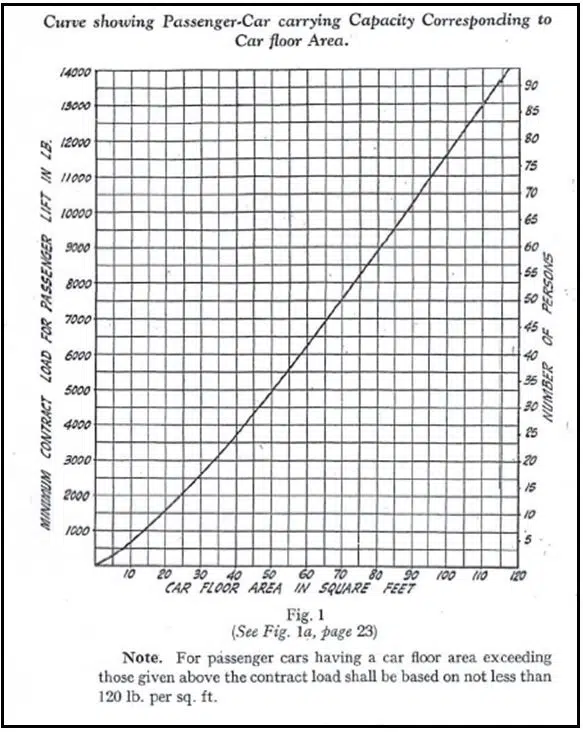 Vào tháng 5 năm 1943, Hội đồng Quốc gia về Công nghiệp Xây dựng của Anh đã sửa đổi Quy tắc thực hành cho thang máy điện tải hàng và tải khách (Code of Practice for Electric Passenger & Goods Lifts and Escalators – COP) năm 1935 của họ để bao gồm một biểu đồ, như được thể hiện trong Hình 1. Biểu đồ này hiển thị một biến phụ thuộc trên trục tung bên phải là số lượng hành khách và trên trục tung bên trái là trọng lượng của chúng tính bằng pound (lb). Biến độc lập là trục hoành chính là diện tích sàn cabin. Trọng lượng hành khách giả định vẫn là 150lb cho mỗi hành khách. Đường kẻ biểu thị mối quan hệ giữa tải trọng định mức và diện tích sàn cabin.