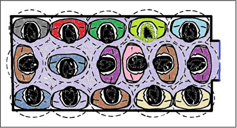 Hành khách trên cabin tải trọng 450kg có không gian cá nhân là 0,22m2 (1,30/6), nhưng hành khách trên cabin tải trọng 2500kg có không gian cá nhân là 0,15m2 (5,00/33). Khoảng không hành khách không bị thu hẹp lại khi cabin ngày càng lớn hơn. Hành khách bắt đầu xâm nhập vào không gian cá nhân của người khác (được hiển thị gạch ngang trong Hình 2). Cuối cùng, không còn khoảng trống (đường liền nét trong Hình 2). Hành khách không chịu được điều này và cảm thấy khó chịu.