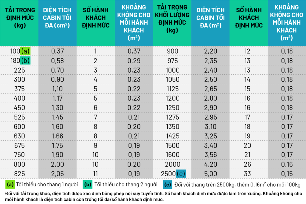 Đối với một loạt các tải trọng định mức, Bảng 2 cho thấy số lượng hành khách tối đa được phép mà mỗi hành khách nặng 75kg và diện tích cabin tối đa có sẵn được yêu cầu là 0,21m2 cho mỗi hành khách.