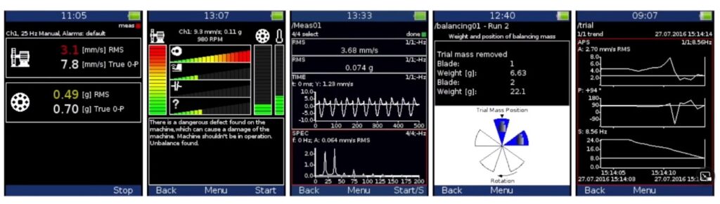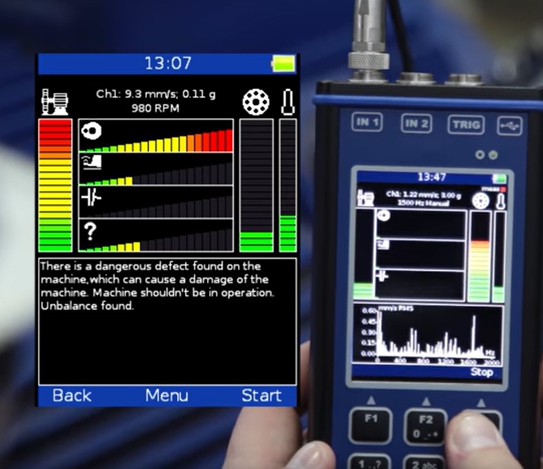 Máy đo độ rung hoặc máy phân tích là một thiết bị điện tử có khả năng xử lý tín hiệu rung. Hãy tưởng tượng rằng máy đo độ rung hoặc máy phân tích là vôn kế. Cảm biến đang tạo tín hiệu điện áp trong khi nó rung trên máy. Tín hiệu điện áp này được truyền qua cáp đến thiết bị đo độ rung.