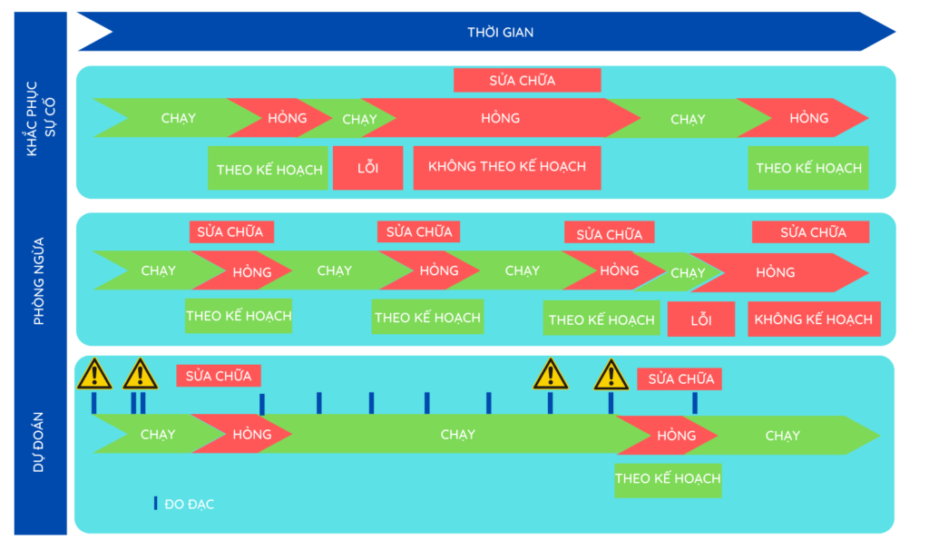 Biểu đồ so sánh hiệu quả của các loại bảo trì: Bảo trì khắc phục sự cố, bảo trì phòng ngừa, bảo trì dự đoán – Nguồn: Adash.com