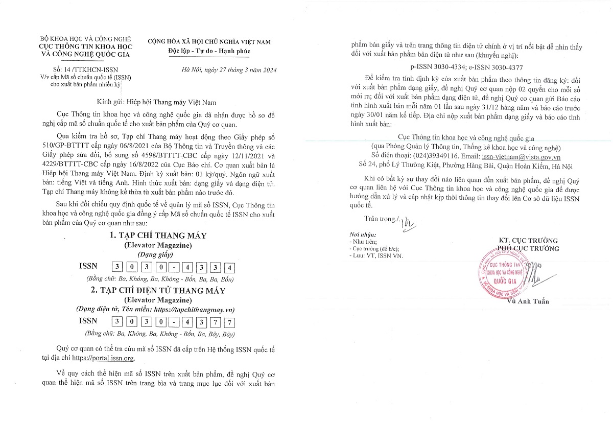 Sau quá trình thẩm định, đánh giá, Cục Thông tin Khoa học và Công nghệ Quốc gia - Bộ Khoa học Công nghệ đã cấp Mã số chuẩn quốc tế ISSN cho xuất bản phẩm bản giấy và xuất bản phẩm điện tử của Tạp chí Thang máy. Cụ thể, mã ISSN xuất bản phẩm bản giấy là ISSN 3030-4334, mã ISSN xuất bản phẩm điện tử là ISSN 3030-4377.