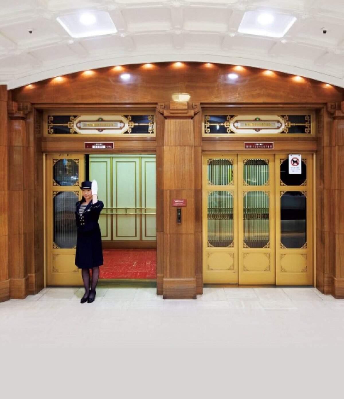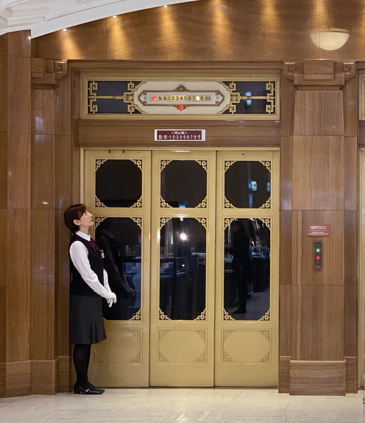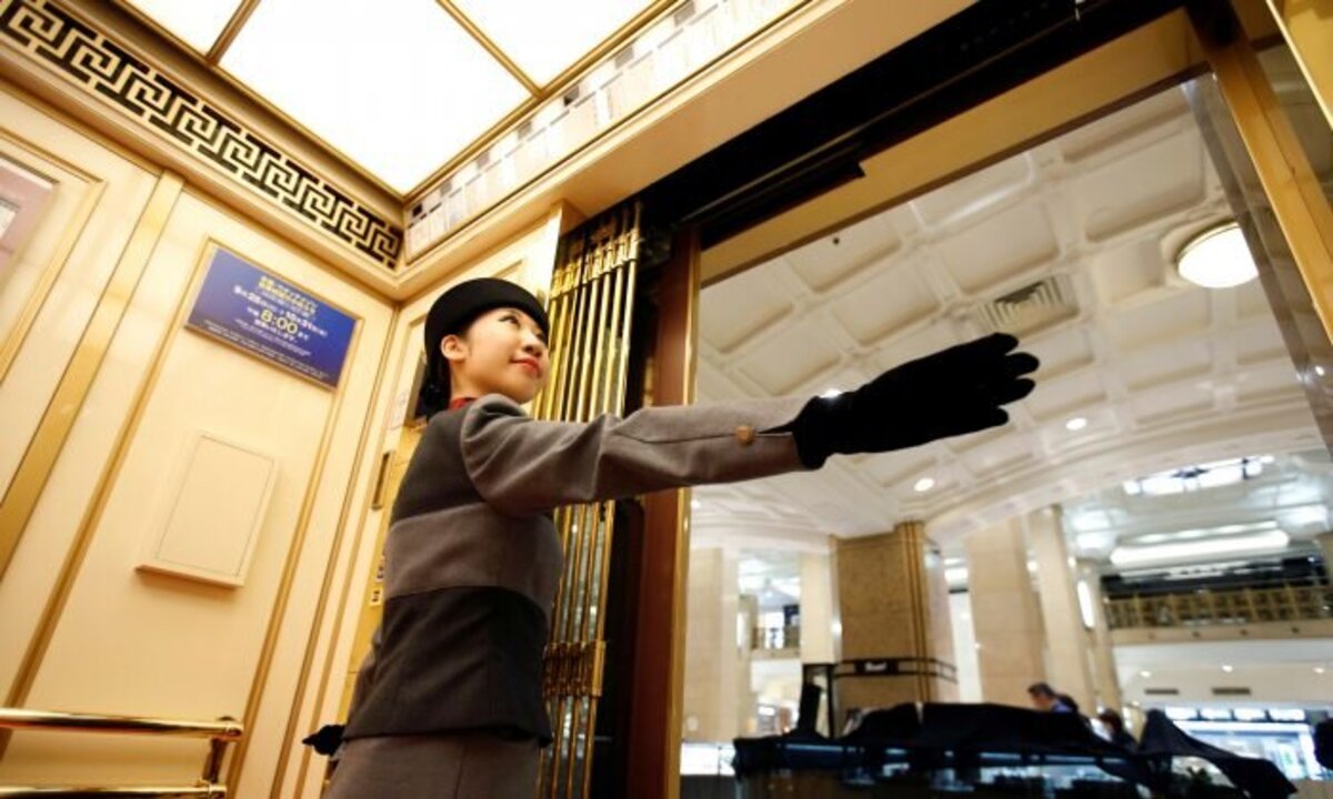 Khi nhân viên điều hành thang máy ấn nút gọi thang, phần cánh tay và cẳng tay tạo góc 90 độ chuẩn xác. Ngay sau khi thang máy mở ra, một nữ nhân viên khác sẽ thực hiện vai trò điều phối bên trong thang máy và tiếp tục màn chào hỏi với khách hàng bằng hàng loạt cái cúi đầu và những lời thân thiện.