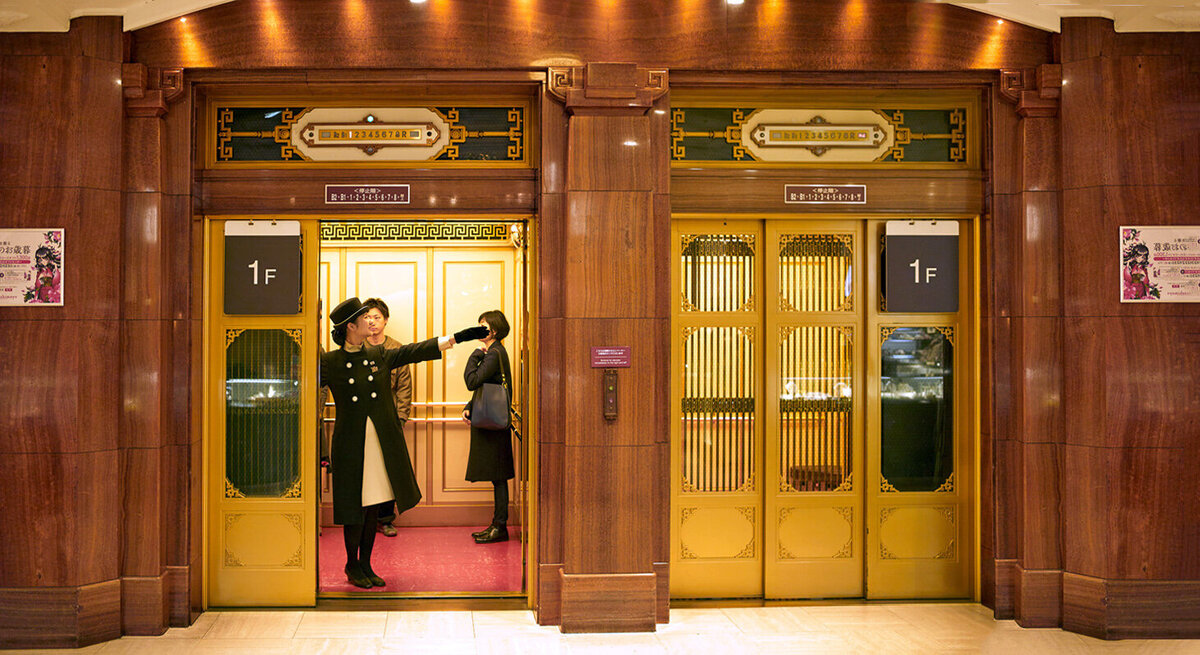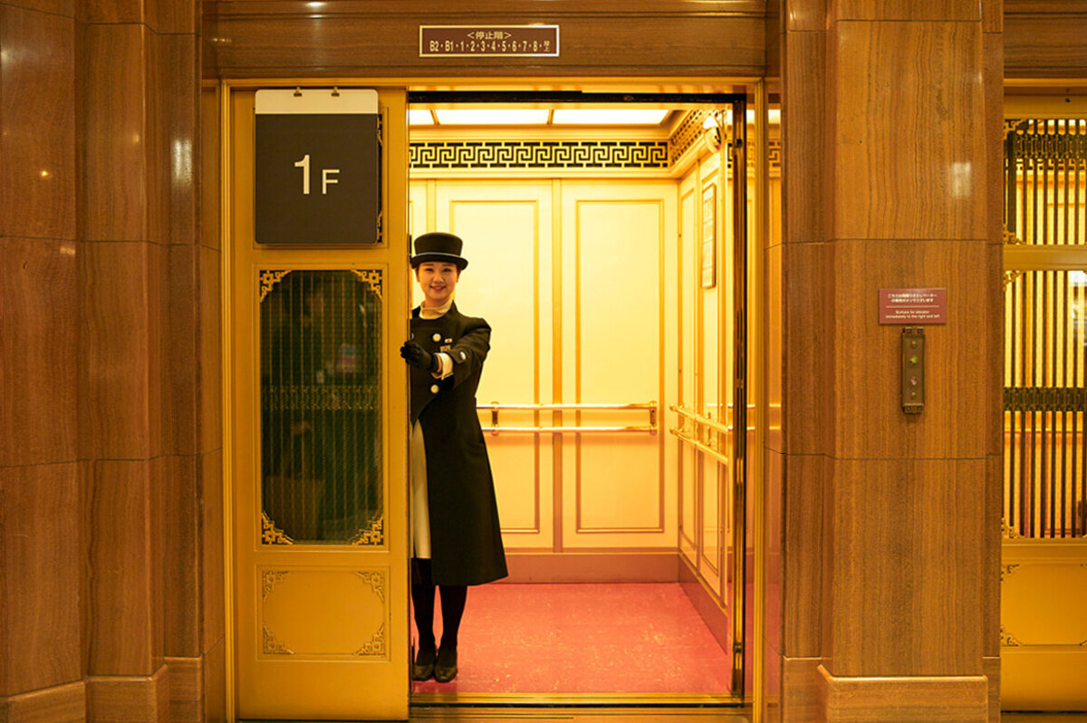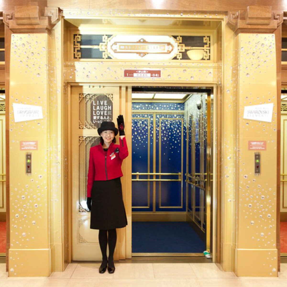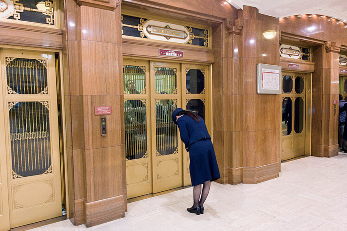 Khi nhân viên điều hành thang máy ấn nút gọi thang, phần cánh tay và cẳng tay tạo góc 90 độ chuẩn xác. Ngay sau khi thang máy mở ra, một nữ nhân viên khác sẽ thực hiện vai trò điều phối bên trong thang máy và tiếp tục màn chào hỏi với khách hàng bằng hàng loạt cái cúi đầu và những lời thân thiện.