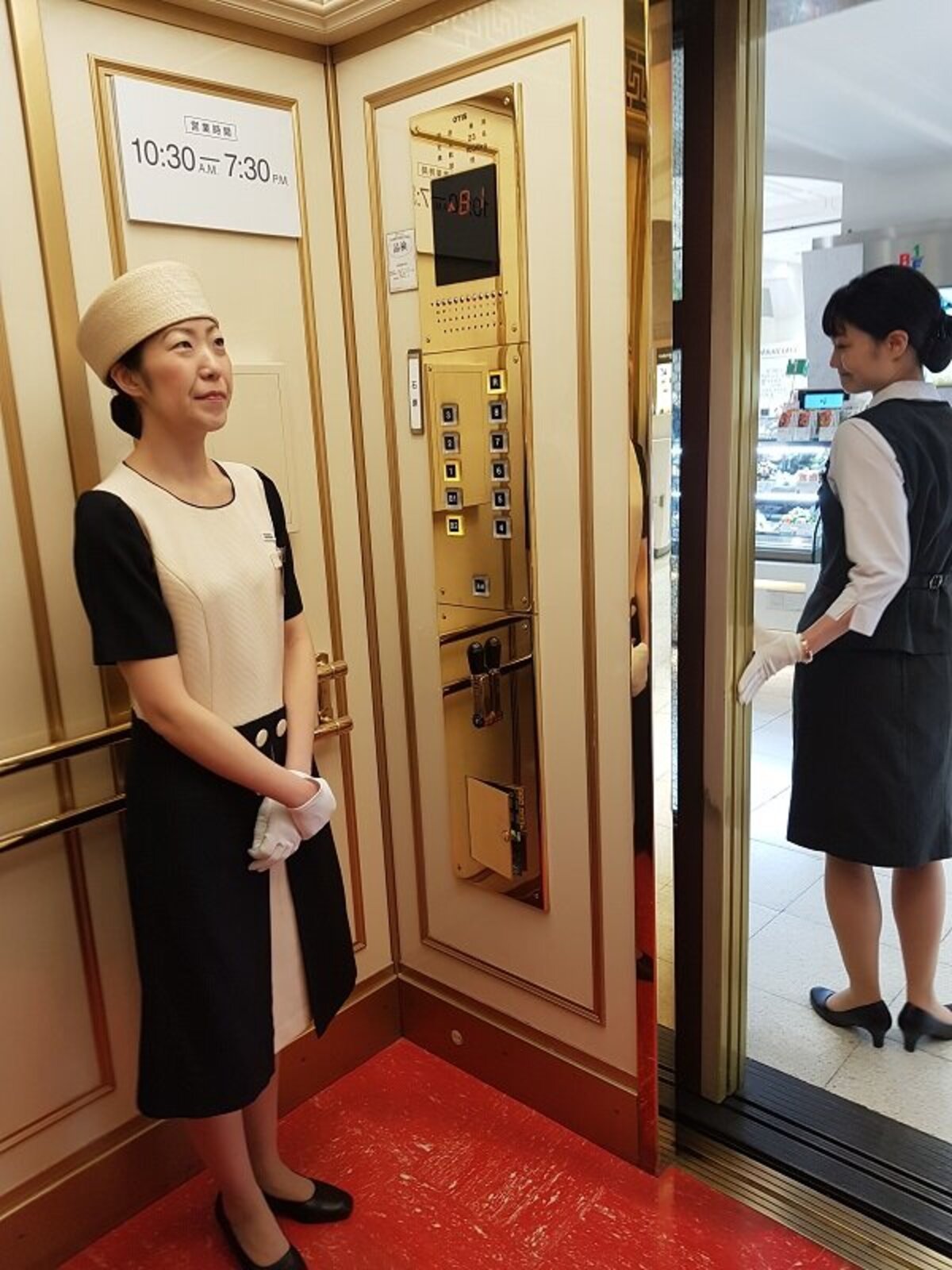 Nhân viên chăm sóc khách hàng tại Nihonbashi Takashimaya cho biết: “Để đảm bảo rằng mọi người trong thang máy đều cảm thấy thoải mái, tôi giao tiếp bằng lời nói và ánh mắt”.