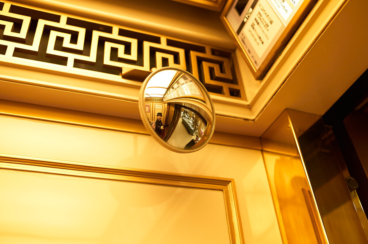 Những chiếc gương cầu lồi được lắp đặt trong thang máy giúp nhân viên quan sát và đảm bảo an toàn cho khách hàng khi sử dụng thang. (Ảnh: Elevator scene studio).