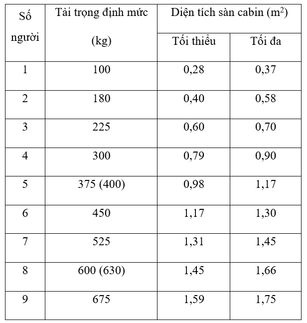 Bảng 1 - Quan hệ giữa số người, tải trọng định mức và diện tích sàn cabin