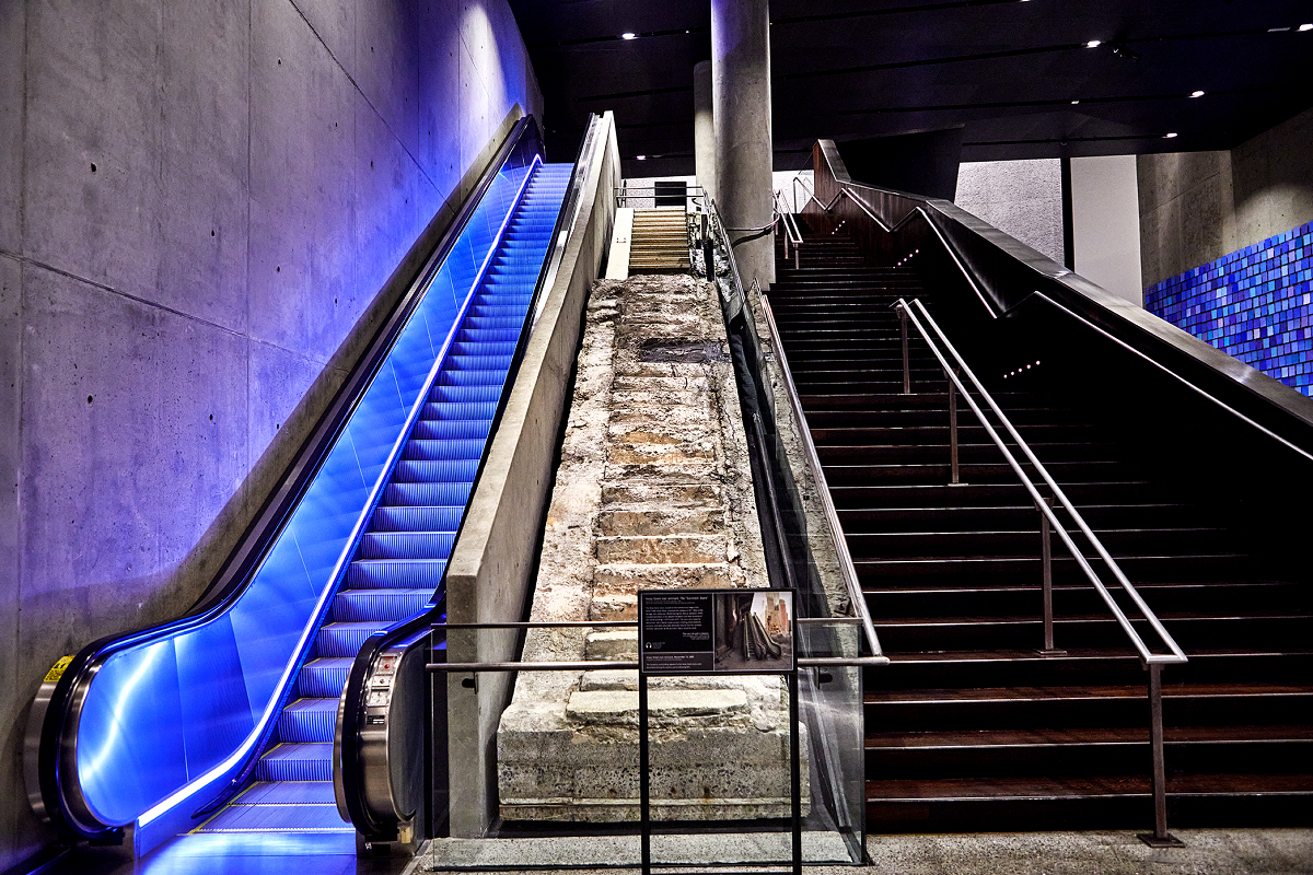Hình ảnh thang bộ thoát hiểm nhỏ, hẹp tại Trung tâm Thương mại Thế giới còn sót lại được trưng bày tại Bảo tàng Tưởng niệm 11/9 của Mỹ