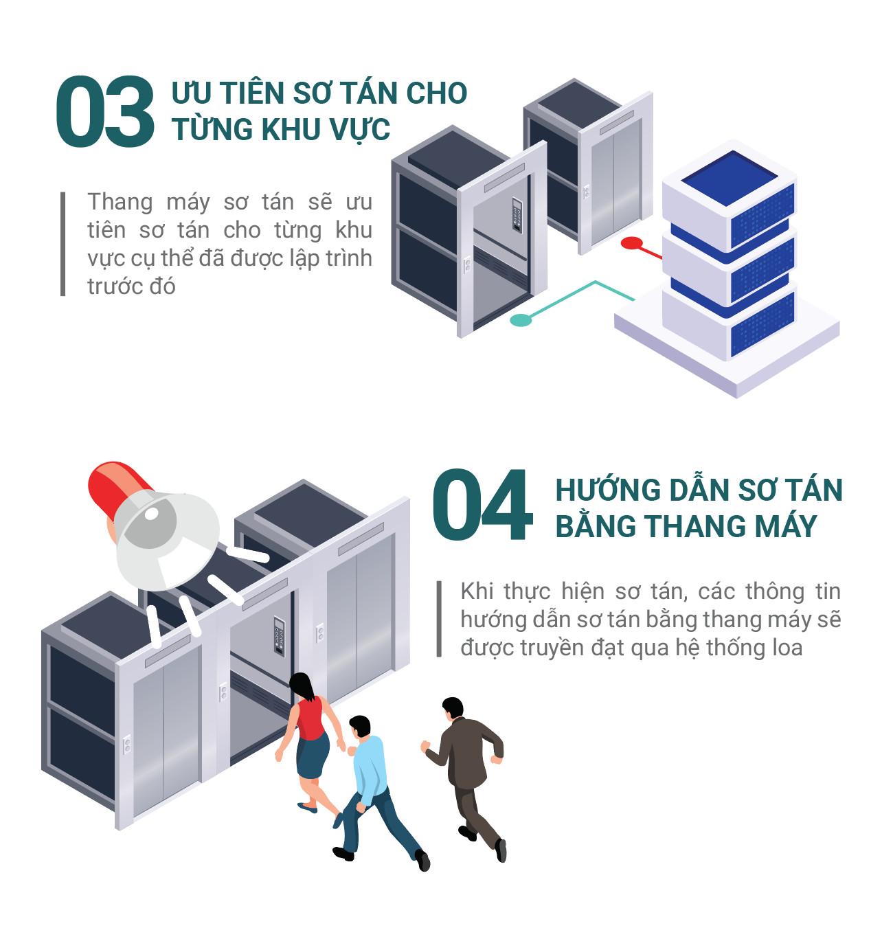 Trong trường hợp sơ tán toàn bộ tòa nhà, thang máy sẽ ưu tiên di tản bắt đầu từ tầng cao nhất, khả năng thoát hiểm thấp nhất và đưa người sơ tán đến khu vực “tầng an toàn” đã được lập trình trước đó.