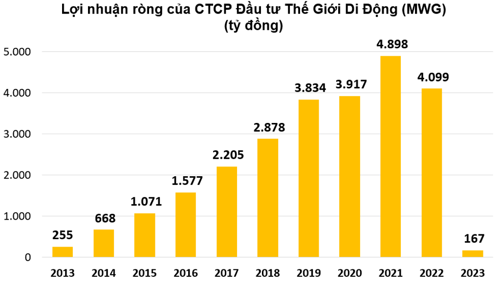 Lợi nhuận ròng của Thế Giới Di Động (MWG) về mức thấp nhất trong hơn một thập kỷ vì chiến lược cạnh tranh giá bán. (Nguồn: Tổng hợp từ báo cáo tài chính đã kiểm toán).