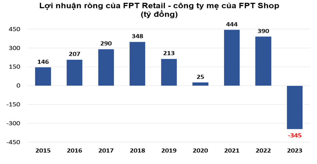 Còn FPT Retail – công ty mẹ của chuỗi FPT Shop phải ngậm ngùi báo lỗ hàng trăm tỷ trong năm 2023. (Nguồn: Tổng hợp từ báo cáo tài chính đã kiểm toán).