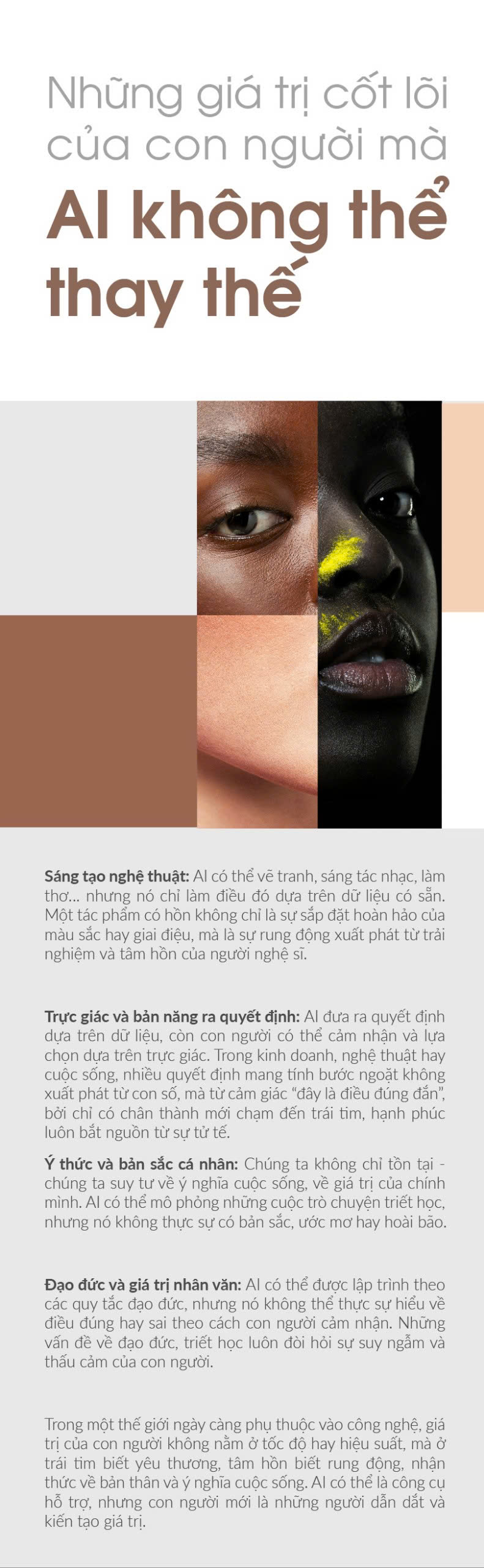 Trong một thế giới ngày càng phụ thuộc vào công nghệ, giá trị của con người không nằm ở tốc độ hay hiệu suất, mà ở trái tim biết yêu thương, tâm hồn biết rung động, nhận thức về bản thân và ý nghĩa cuộc sống. AI có thể là công cụ hỗ trợ, nhưng con người mới là những người dẫn dắt và kiến tạo giá trị.
