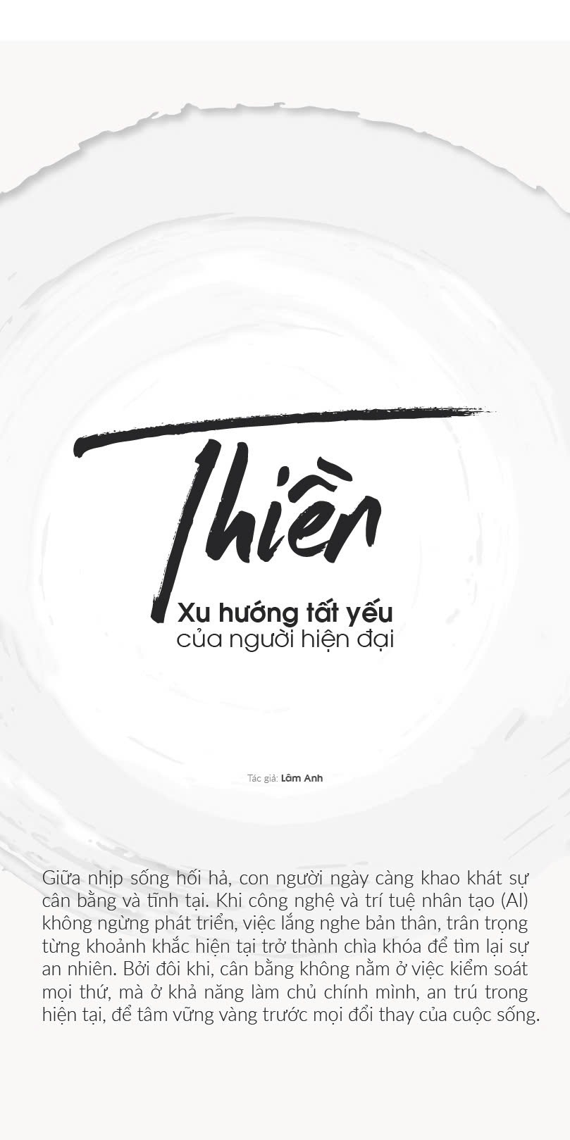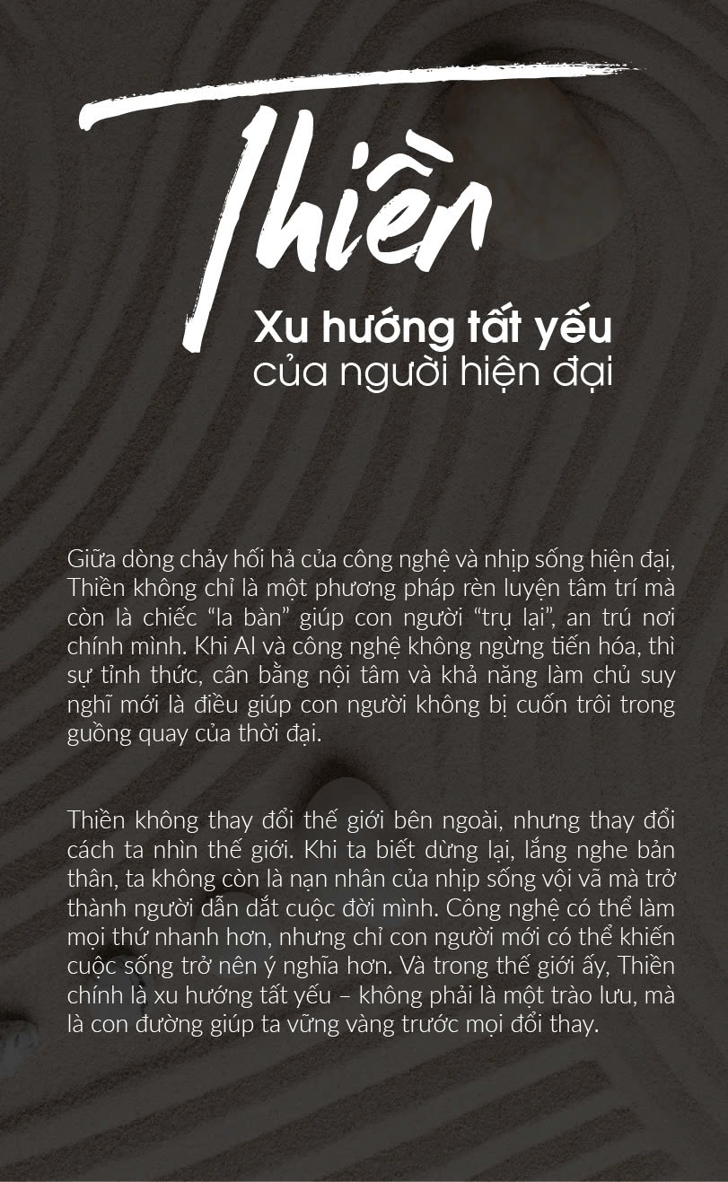Giữa dòng chảy hối hả của công nghệ và nhịp sống hiện đại, Thiền không chỉ là một phương pháp rèn luyện tâm trí mà còn là chiếc “la bàn” giúp con người “trụ lại”, an trú nơi chính mình. Khi AI và công nghệ không ngừng tiến hóa, thì sự tỉnh thức, cân bằng nội tâm và khả năng làm chủ suy nghĩ mới là điều giúp con người không bị cuốn trôi trong guồng quay của thời đại.