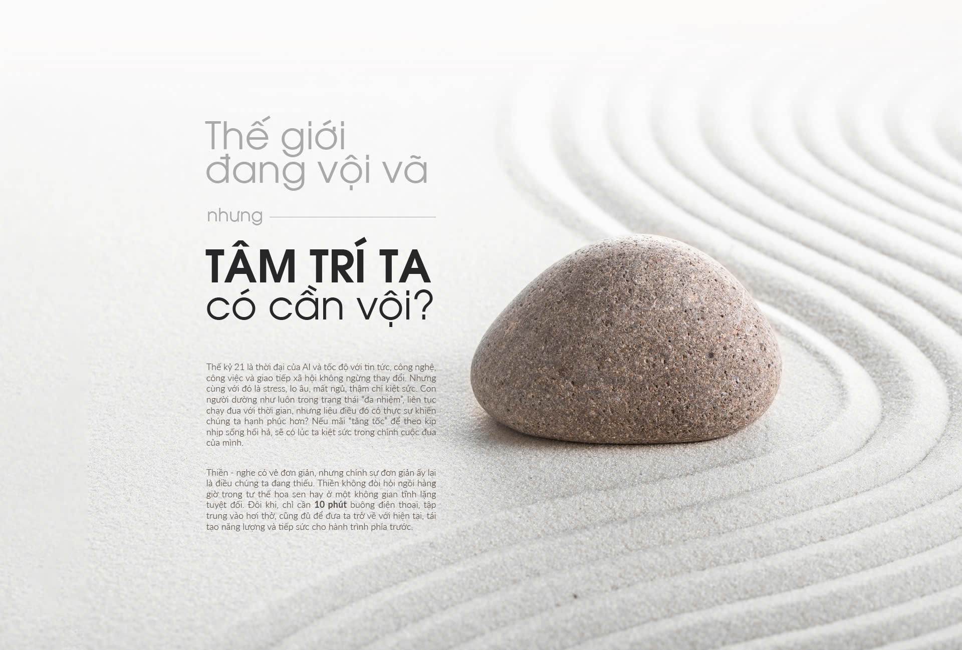 Thế kỷ 21 là thời đại của AI và tốc độ với tin tức, công nghệ, công việc và giao tiếp xã hội không ngừng thay đổi. Nhưng cùng với đó là stress, lo âu, mất ngủ, thậm chí kiệt sức. Con người dường như luôn trong trạng thái “đa nhiệm”, liên tục chạy đua với thời gian, nhưng liệu điều đó có thực sự khiến chúng ta hạnh phúc hơn? Nếu mãi “tăng tốc” để theo kịp nhịp sống hối hả, sẽ có lúc ta kiệt sức trong chính cuộc đua của mình.