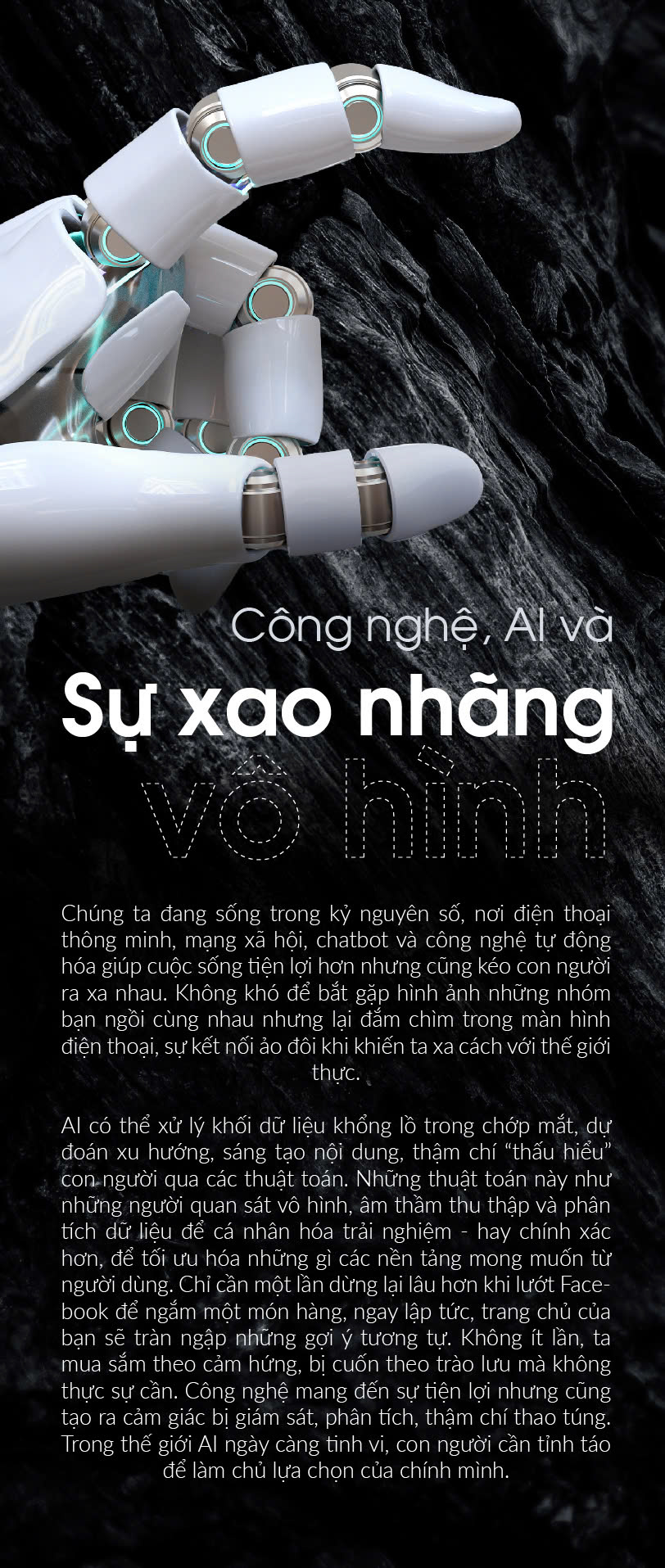 AI có thể xử lý khối dữ liệu khổng lồ trong chớp mắt, dự đoán xu hướng, sáng tạo nội dung, thậm chí “thấu hiểu” con người qua các thuật toán. Những thuật toán này như những người quan sát vô hình, âm thầm thu thập và phân tích dữ liệu để cá nhân hóa trải nghiệm - hay chính xác hơn, để tối ưu hóa những gì các nền tảng mong muốn từ người dùng. Chỉ cần một lần dừng lại lâu hơn khi lướt Facebook để ngắm một món hàng, ngay lập tức, trang chủ của bạn sẽ tràn ngập những gợi ý tương tự. Không ít lần, ta mua sắm theo cảm hứng, bị cuốn theo trào lưu mà không thực sự cần. Công nghệ mang đến sự tiện lợi nhưng cũng tạo ra cảm giác bị giám sát, phân tích, thậm chí thao túng. Trong thế giới AI ngày càng tinh vi, con người cần tỉnh táo để làm chủ lựa chọn của chính mình.
