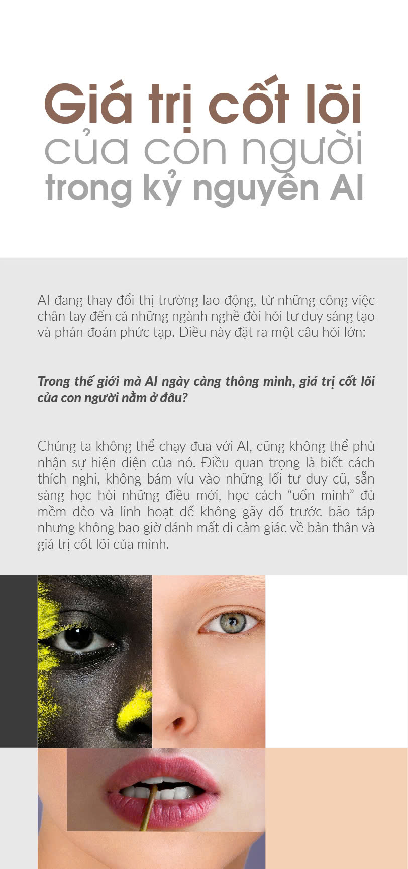 Chúng ta không thể chạy đua với AI, cũng không thể phủ nhận sự hiện diện của nó. Điều quan trọng là biết cách thích nghi, không bám víu vào những lối tư duy cũ, sẵn sàng học hỏi những điều mới, học cách “uốn mình” đủ mềm dẻo và linh hoạt để không gãy đổ trước bão táp nhưng không bao giờ đánh mất đi cảm giác về bản thân và giá trị cốt lõi của mình.