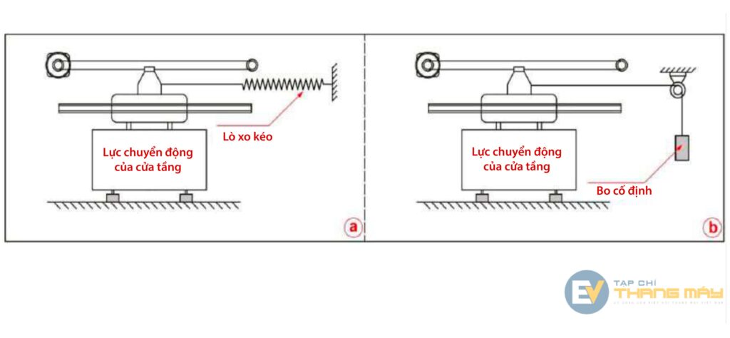 Lò xo kéo dãn lưu trữ năng lượng ở dạng đàn hồi. Trong điều kiện hoạt động mà chúng không vượt quá giới hạn biến dạng đàn hồi, lò xo sẽ sử dụng năng lượng tích trữ để đóng các cánh cửa hoàn toàn với tổn thất năng lượng là tối thiểu. Cần xác định lực tối thiểu để đóng và khóa cửa tầng. Phương pháp phân tích động có thể được sử dụng cho tính toán này.