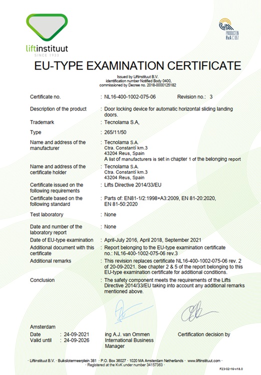 Chứng nhận thử nghiệm thiết bị khóa cửa tầng tuân thủ theo tiêu chuẩn EN81 do một tổ chức thử nghiệm thực hiện