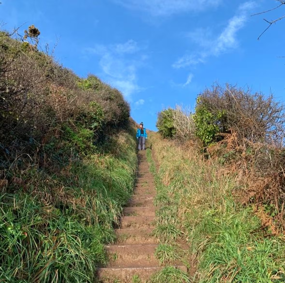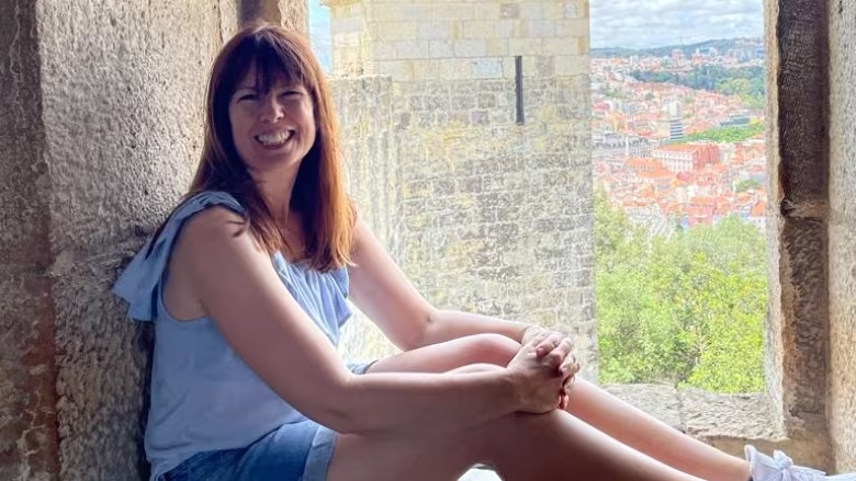 Nugent đứng trên cầu thang trong một chuyến đi bộ đường dài ở Anh. Việc mắc chứng sợ độ cao đã từng gây ảnh hưởng lớn đến cuộc sống của cô.