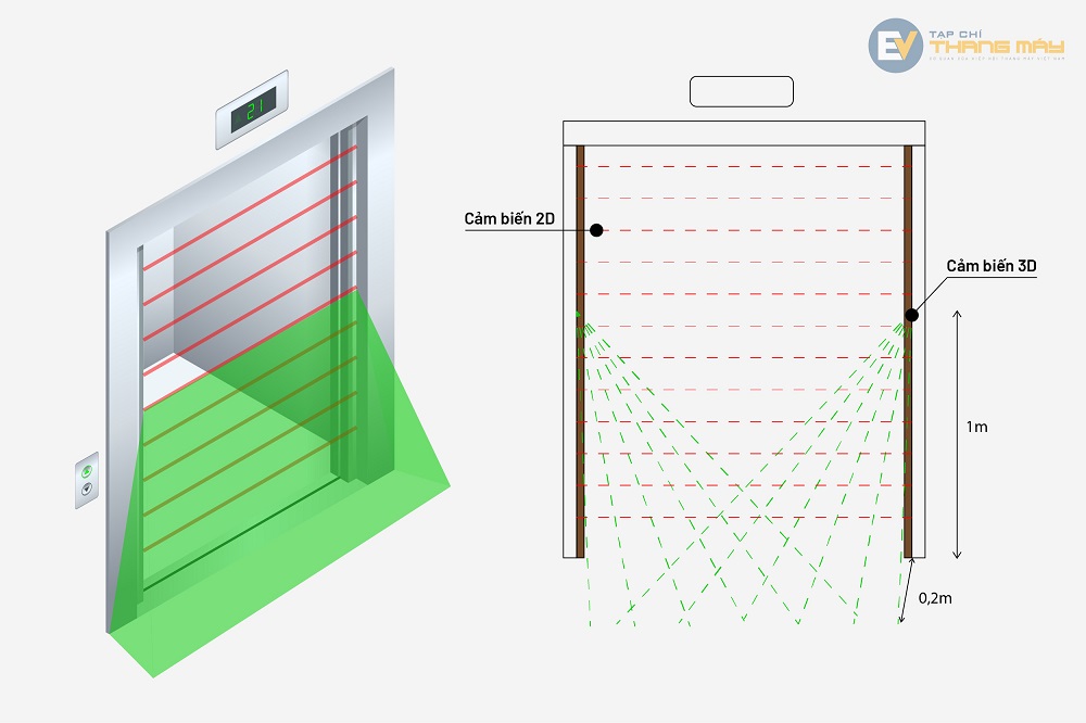 Cảm biến 2D chính là công nghệ mành hồng ngoại kể trên, các tia hồng ngoại nhằm phát hiện vật cản bao phủ trên hai cạnh cửa thang máy (door to door). Công nghệ này chỉ phát hiện được các vật cản trên đường nối giữa hai cửa, còn khi tích hợp thêm cảm ứng 3D thì không gian phát hiện vật cản sẽ rộng hợp, mang tính dự báo cao hơn tránh các tình huống nguy hiểm cho người và vật.