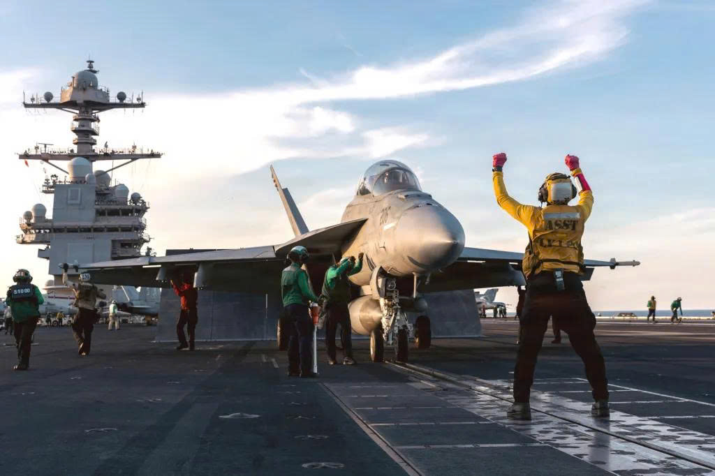 Một chiếc máy bay tiêm kích F/A-18F Super Hornet đang được chuẩn bị cất cánh từ tàu sân bay USS Gerald R. Ford