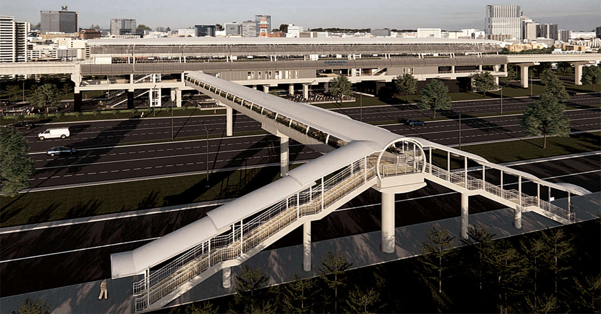 Theo thiết kế, mỗi cầu bộ hành dài hơn 70m, rộng 3,5m, kết nối từ tầng trung chuyển khách của nhà ga với khu dân cư, trạm xe buýt bên đường. Cầu được thiết kế đồng bộ kiến trúc với nhà ga chính, tối ưu hóa về diện tích sử dụng, diện tích trồng cây xanh.
