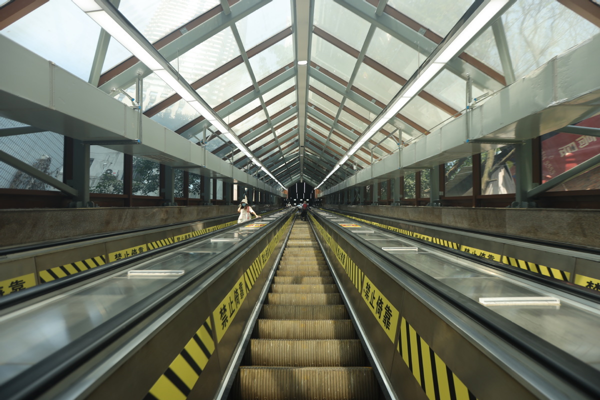 Thang cuốn dài 112m, tương đương một tòa nhà 31 tầng, có độ dốc 30 độ, là một trong số đó. Đây là thang cuốn dài nhất ở Trung Quốc và thứ nhì châu Á, mang tên Hoàng Quan. Người dân ở đây sẽ phải mua vé để được đi thang với giá 2 nhân dân tệ (gần 7.000 đồng) cho một lượt lên hoặc xuống với thời gian khoảng 2 phút 30 giây.