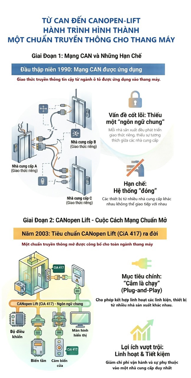 Cách tiếp cận này giúp giảm chi phí, rút ngắn thời gian thiết kế - lắp đặt - bảo trì, đồng thời hạn chế sự phụ thuộc vào một nhà cung cấp duy nhất trong suốt vòng đời thang máy.