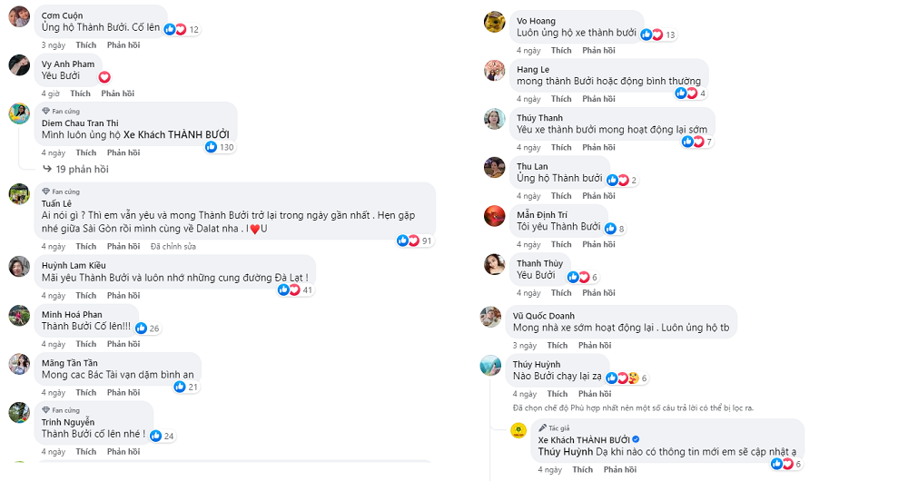 Nhiều khách hàng chia sẻ sự ủng hộ và yêu mến dành cho Nhà xe Thành Bưởi trên Fanpage Facebook của nhà xe này sau khi nhà xe này thông báo tạm dừng hoạt động