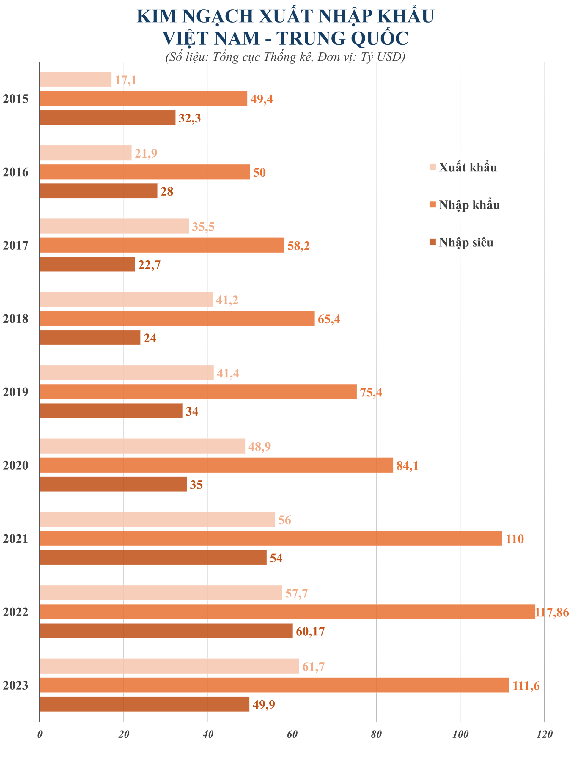 Thâm hụt cao, gia tăng được đánh giá là lo ngại bởi Trung Quốc là thị trường Việt Nam nhập rất nhiều hàng hóa. Trong năm 2023, Việt Nam nhập siêu từ Trung Quốc 49,9 tỷ USD. Việt Nam đã chi 111,6 tỷ USD trong năm 2023 để nhập khẩu hàng hóa từ quốc gia tỷ dân này.
