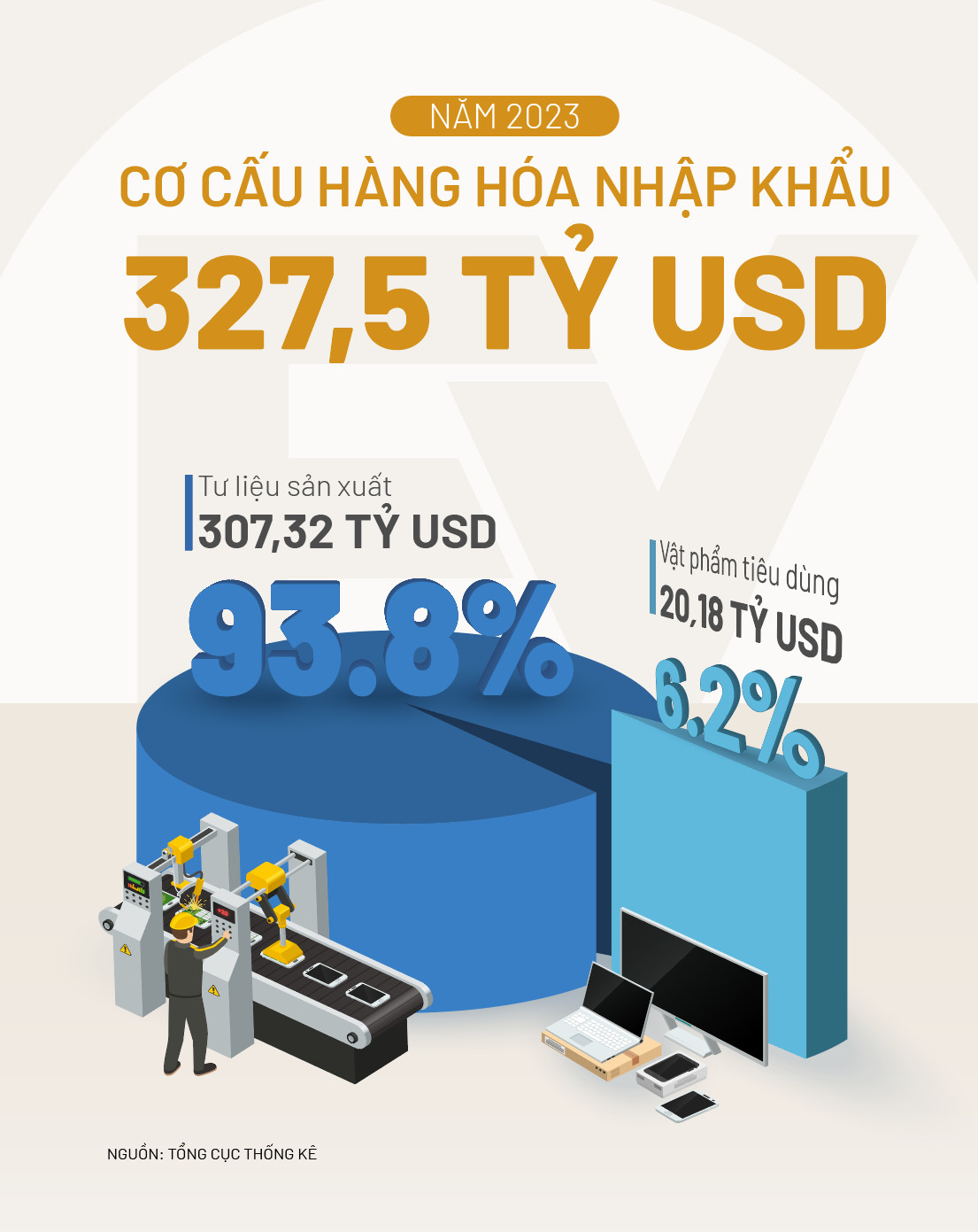 Trên thực tế, trong năm 2023, Việt Nam đã chi hơn 307 tỷ USD để nhập khẩu tư liệu sản xuất, con số này chiếm 93,8% cơ cấu nhóm hàng hóa nhập khẩu. Trong đó, nhóm hàng máy móc thiết bị, dụng cụ phụ tùng chiếm 45,8%; nhóm hàng nguyên, nhiên, vật liệu chiếm 48%.